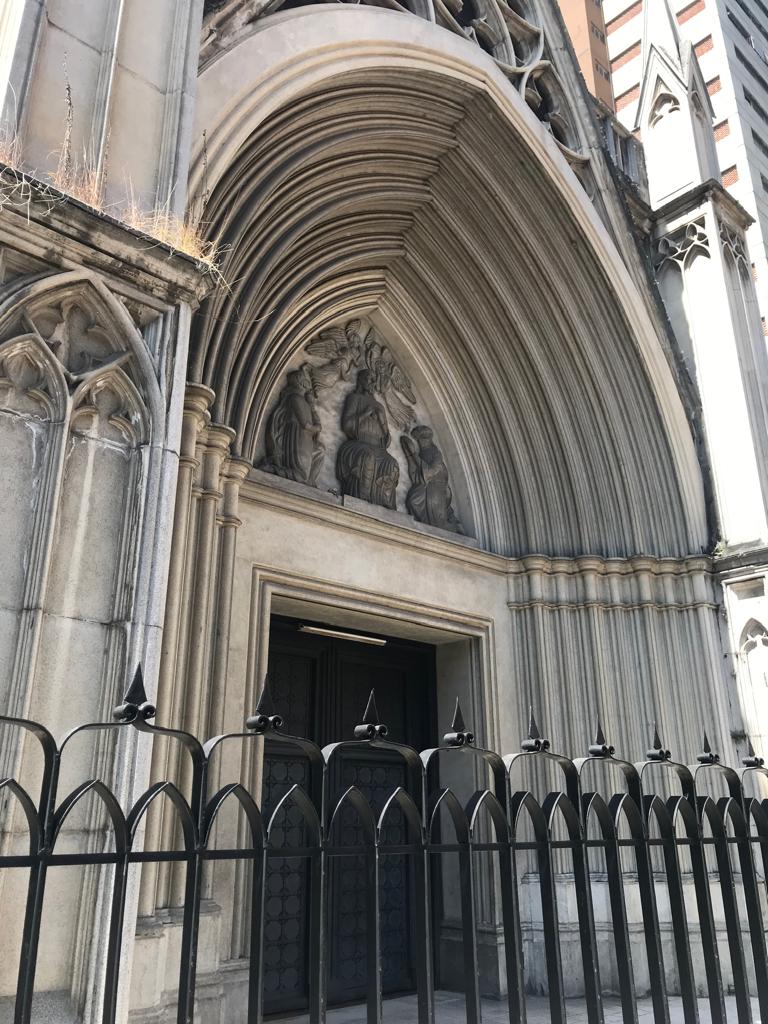 A los lados del cuerpo central se aprecian los arbotantes y las naves laterales que no tienen puertas de entrada, pero sí vanos de arcos ojivales. En el nivel superior de la fachada se encuentra un rosetón cerrado con vitrales y sobre este se eleva el cimborrio y la torre.